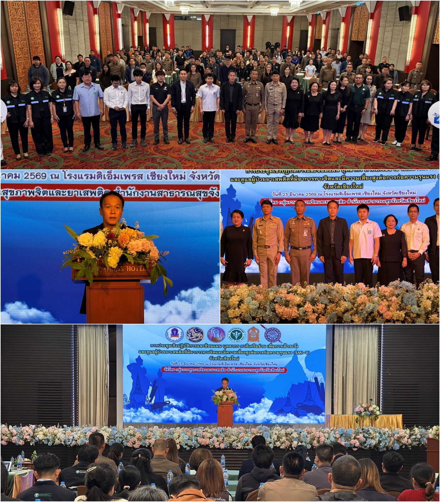 วันที่ 23 มี.ค. 69 ที่ ห้องอิมพีเรียลบอลรูม โรงแรมดิเอ็มเพรส เชียงใหม่ นายศิวะ ธมิกานนท์ รองผู้ว่าราชการจังหวัดเชียงใหม่ เป็นประธานเปิดการประชุมเชิงปฏิบัติการ “การพัฒนาสมรรถนะบุคลากร เพื่อเฝ้าระวังและดูแลผู้ติดยาเสพติดที่มีอาการทางจิต และมีความเสี่ยงสูงต่อการก่อความรุนแรง (SMI-V) จังหวัดเชียงใหม่” ซึ่งกลุ่มงานสุขภาพจิตและยาเสพติด สำนักงานสาธารณสุขจังหวัดเชียงใหม่จัดขึ้น เพื่อยกระดับการดูแลผู้ป่วยกลุ่มเสี่ยง ตั้งแต่การเฝ้าระวัง ป้องกัน ไปจนถึงการรับมือเมื่อเกิดเหตุ และการดูแลต่อเนื่องหลังเหตุการณ์ โดยเน้นการทำงานร่วมกันของทุกภาคส่วน